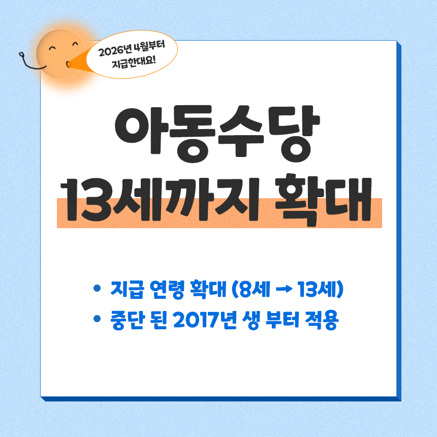 2026λ λΆν° μλμλΉ μ λκ° ν¬κ² λ¬λΌμ§λλ€. κΈ°μ‘΄ 8μΈ λ―Έλ§μμ 13μΈ λ―Έλ§κΉμ§ λ¨κ³μ μΌλ‘ νλλκ³ , λΉμλκΆ λ° μΈκ΅¬κ°μμ§μ κ±°μ£Ό μλμκ²λ μΆκ° μ§μκΈλ μ§κΈλ©λλ€.